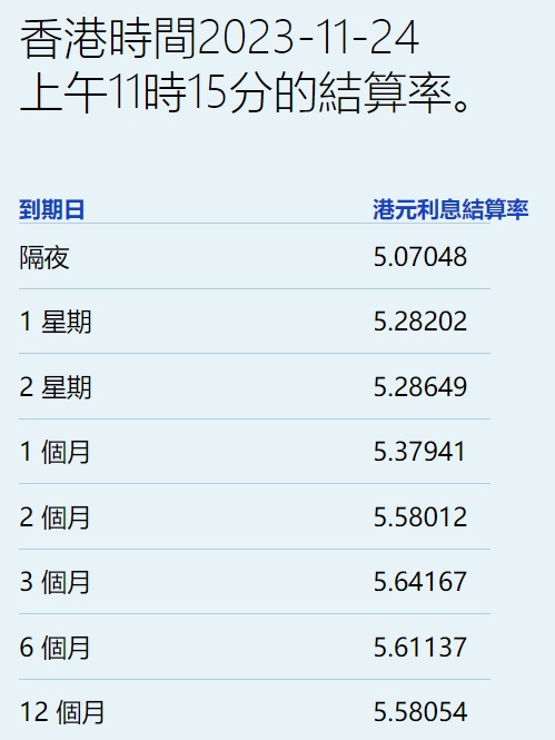 智通财经APP获悉,11月24日,港元拆息个别发展,但仍普遍上升。与楼按相关的一个月拆息微升至5.37941%,续见9月29日以来最高,三个月期进一步升至5.64167%,续创近23年新高。不过,隔夜息轻微回落至5.07048%,六个月及一年期拆息中止六连升,分别报5.61137%和5.58054%。