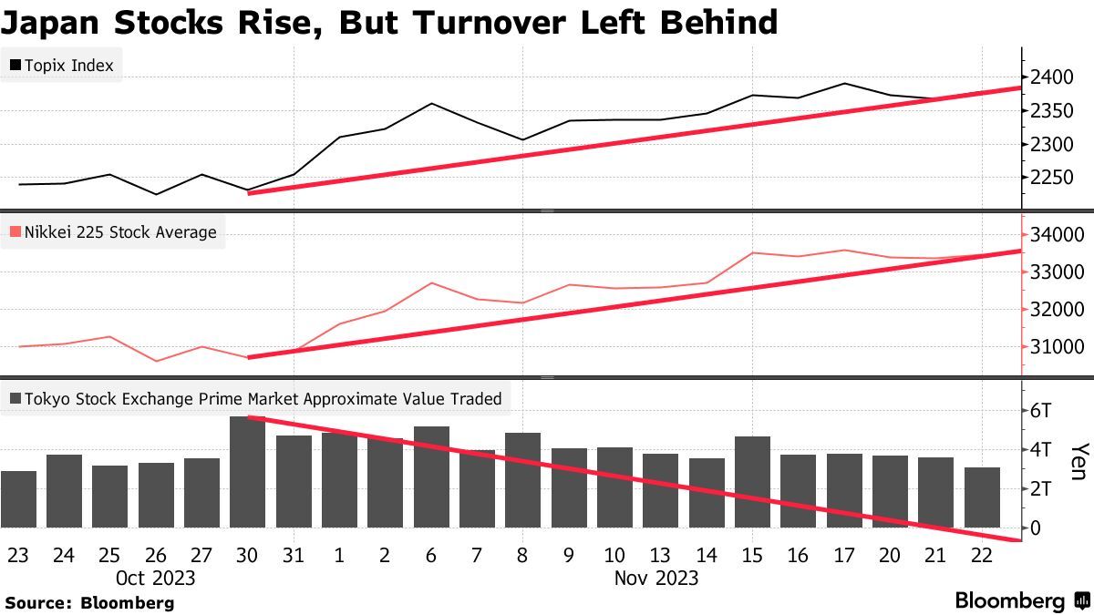 智通财经APP获悉,日本股市需要新的催化剂才能果断突破33年新高,因为成交量不足表明,投资者的兴趣尚未恢复。媒体汇编的数据显示,自本月初达到短期峰值以来,东京证券交易所的日交易量一直在下降,尽管日经225指数周一短暂突破了今年的盘中高点。