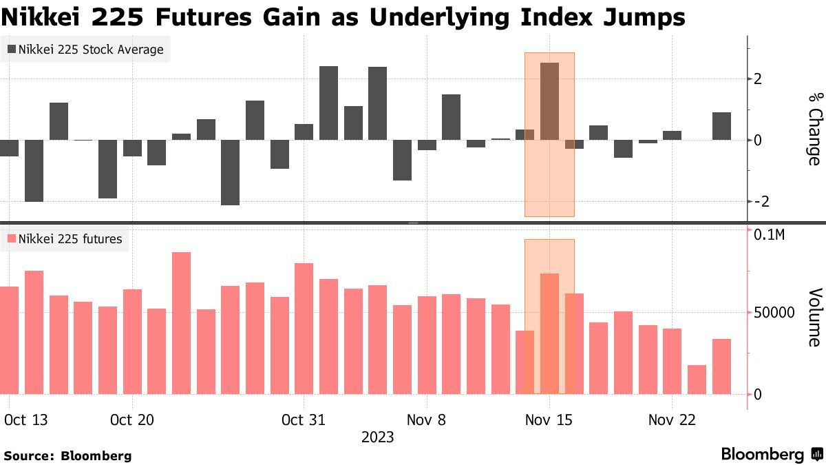 11月15日,日经225指数期货的日交易量达到本月高点,日经225指数在同一天创下了今年以来的最大涨幅。这表明,包括对冲基金在内的投机头寸是股市上涨的幕后推手。