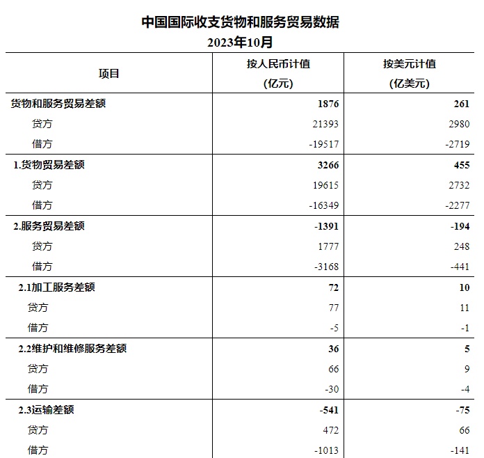 按美元计值,2023年10月,我国国际收支货物和服务贸易出口2980亿美元,进口2719亿美元,顺差261亿美元。