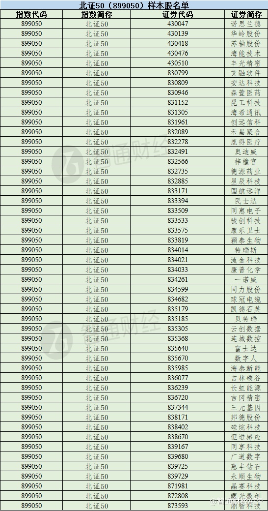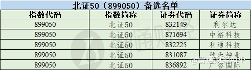 智通财经APP获悉,11月24日,北交所和中证指数有限公司发布《关于北证50(899050)样本股定期调整的公告》。根据指数编制方案,北交所和中证指数有限公司对北证50(899050)样本股及备选名单进行定期调整,于2023年12月11日正式生效。北证50(899050)样本股名单包括诺思兰德(430047)、华岭股份(430139)等50只标的。北证50(899050)备选名单包括利尔达(832149)、中裕科技(871694)等5只标的。