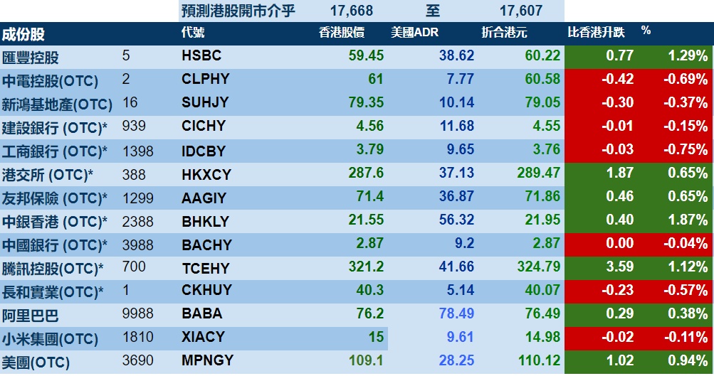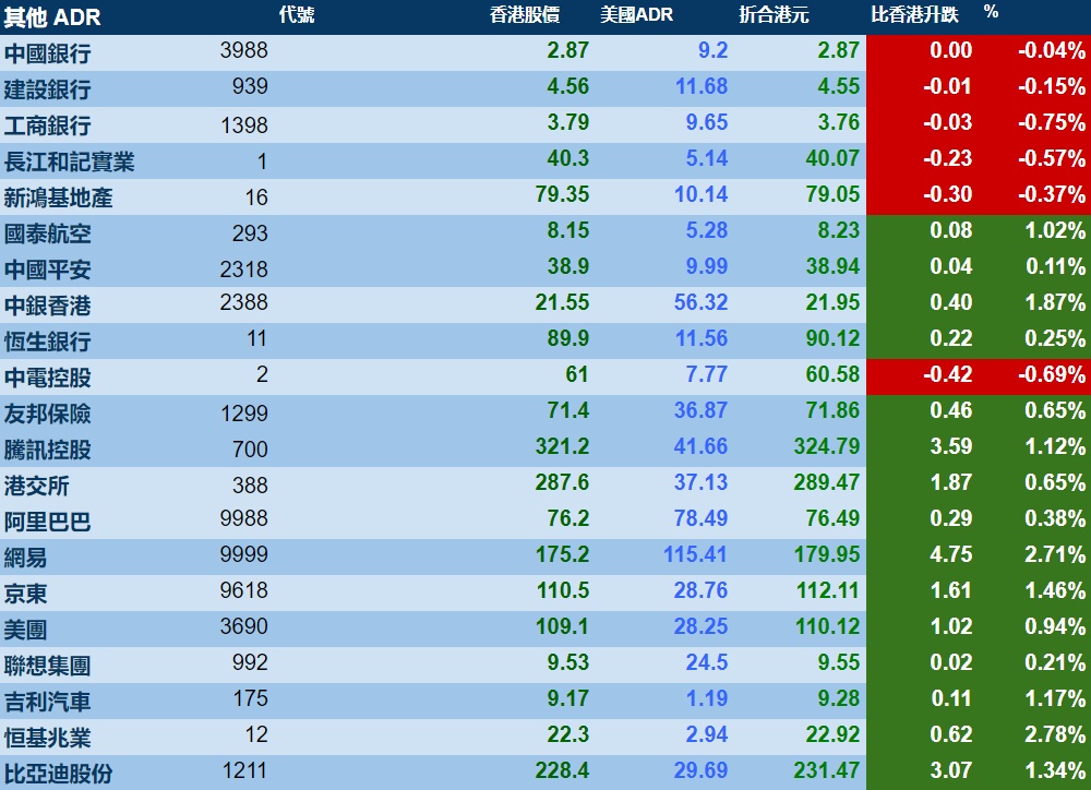 智通财经APP获悉,周五美股三大指数涨跌不一,港股ADR指数上涨,按比例计算,收报17668点,较香港收市涨108.56点或0.61%。