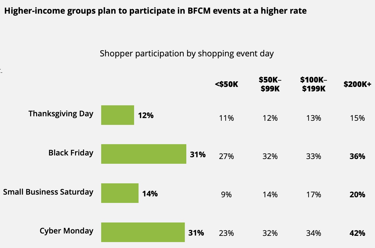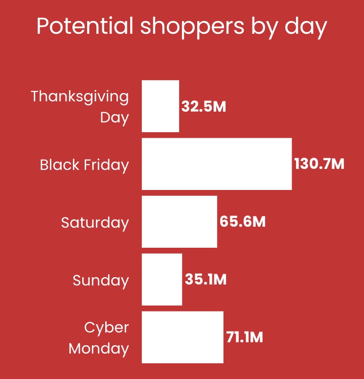 上周,根据全美零售联合会(NRF)的数据,从感恩节到“网络星期一”,全美估计有1.82亿人计划在实体店和线上购物,较去年多出1570万人,这是该联合会自2017年追踪该数据以来的最高预估值;72%(1.307亿人)的消费者计划购物,这一比例高于2022年的69%。