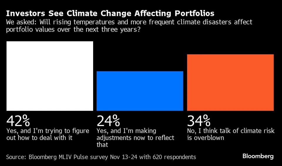在此背景下,三分之二的MLIV Pulse受访者预计气候变化将在未来三年内影响投资组合价值。这与之前的类似调查相呼应,本月早些时候发布的一项调查发现,89%的投资者承认,ESG指标将继续存在。今年8月发布的一项针对彭博终端用户的民意调查发现,约三分之二的人表示,ESG太重要了,不容忽视,尽管他们不喜欢这个标签。