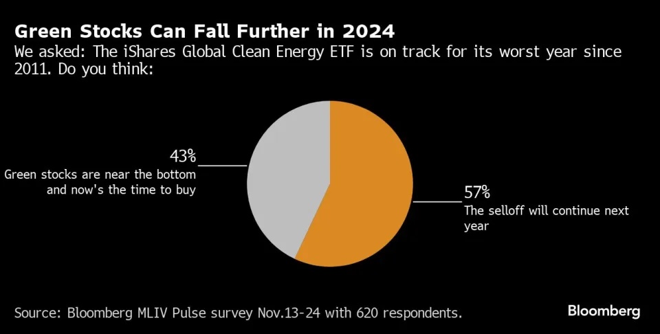 最新的Markets Live Pulse(MLIV Pulse)调查显示,席卷绿色股票的抛售浪潮似乎将持续到2024年,这将是绿色股票连续第四年下跌。负面情绪似乎将席卷更广泛的绿色资产类别,特斯拉公司(TSLA.US)被认为有可能被踢出标普500指数前十大成份股的地位。在MLIV Pulse的620名受访者中,近三分之二的人表示,他们计划远离电动汽车行业,57%的人预计iShares全球清洁能源ETF将在2024年延续跌势,该基金今年下跌了约30%。