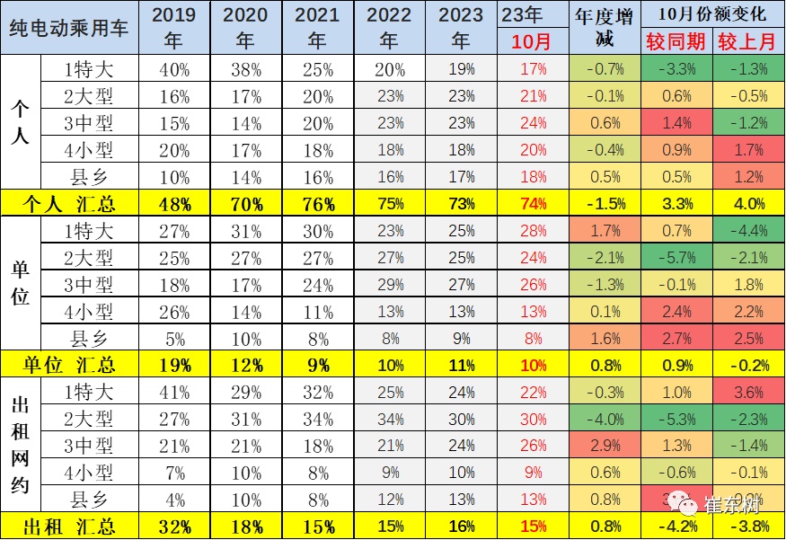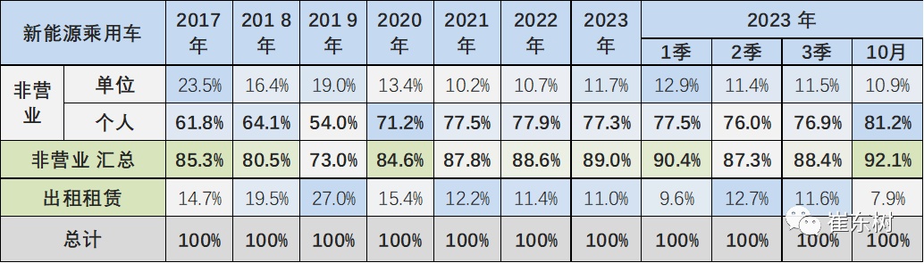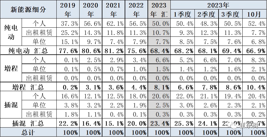 2018-2019年新能源乘用车的出租租赁类占比逐步提升,随后2020年开始的纯电动出租租赁的占比持续下降。今年的市场需求逐步向私人消费走强, 2023年10月出租租赁的占比在7.9%,较年初偏低。