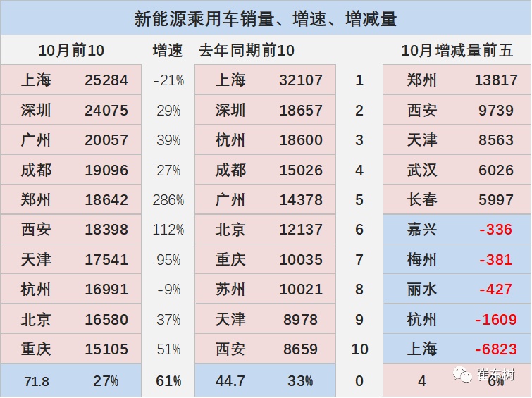 10月的新能源车增长主力是前期受抑制的疫情重灾区,限购的上海、杭州等限购表现较差。10月的新能源车增长主力还有郑州、西安、武汉等非限购核心大城市。下滑的是杭州和上海等市场区域。