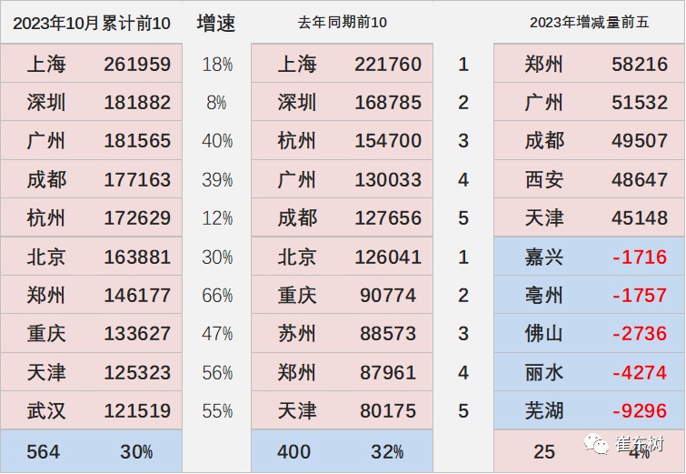 2023年新能源车相对于2022年同期仍是大幅增长,上海、广州、成都、杭州、郑州增长都相对较为迅猛,形成增量的核心推动力量。