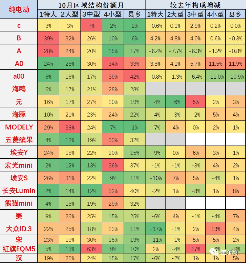 从主力车型的表现来看,也是体现了主力车型在大中城市的表现改善,尤其是10月以比亚迪为代表的增量,相比较同期的份额增量是中型市场增长1-2个百分点。从特斯拉来看, 10月份较同期的的主力区域更延伸到中小城市市场,特大型城市的纯电动市场增长相对较好。