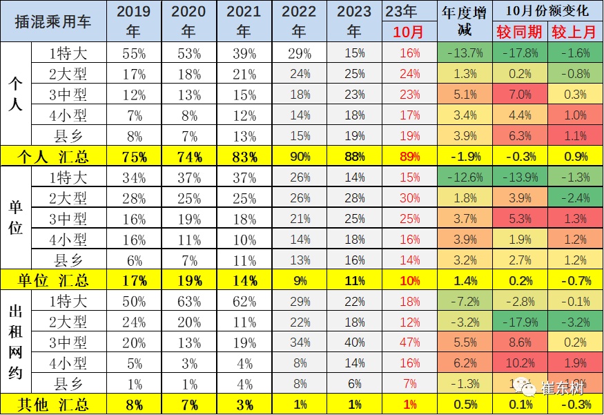 插电混动车型的单位用车和出租占比持续萎缩。插混出租租赁车型主要的需求在特大城市和大型城市市场,今年的特大型城市插混出租大幅萎缩。