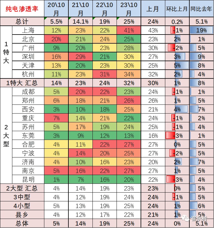 而非限购城市中的大型城市、中型城市和小型城市的新能源车的纯电动车的销量占比基本相同,2019年和2020年都在偏低的水平,今年中等城市的10月上升到24%,县乡市场的渗透率提升表现也是较强。