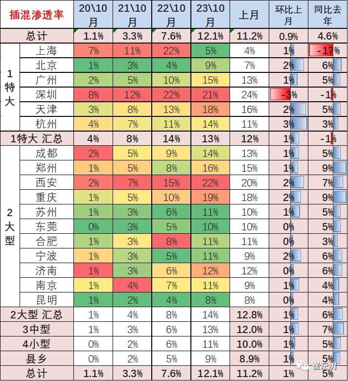 上海由于插混牌照政策的拉动,10月插混占比5%,回落较大。