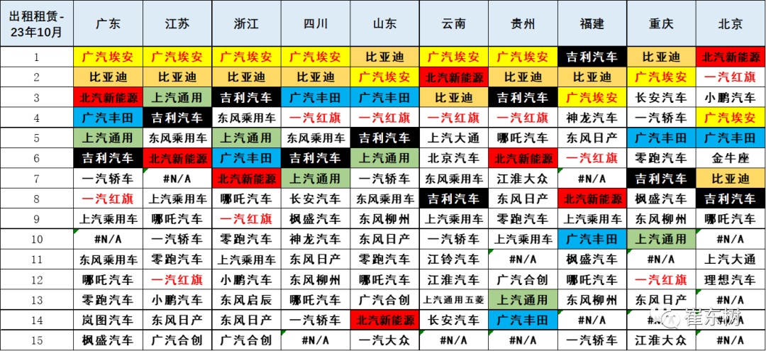 各地出租市场的表现相对差异化较大。今年10月表现较强的出租市场是广东、浙江、江苏等。其中各个厂家在各地的出租市场表现也是差异较大,有些地区的本地产品在本地出租市场的占有率并不一定很高。