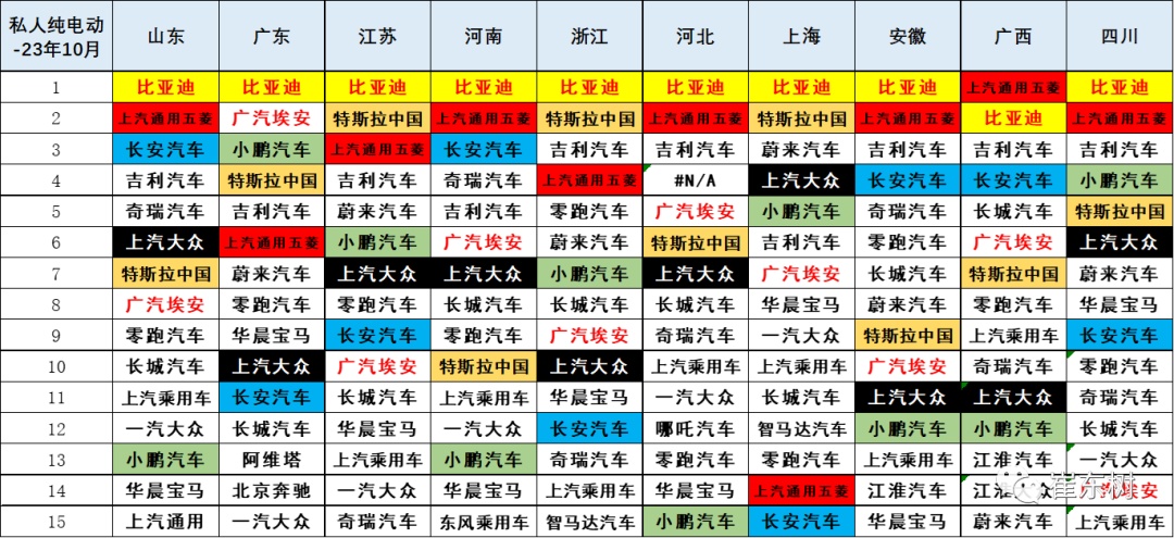 私人纯电动市场的特色相对鲜明,高端化趋势极其明显。比亚迪表现优秀,广东、江苏、浙江等发达地区基本都是第一。