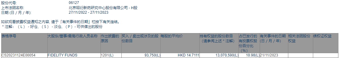 FUNDS减持昭衍新药(06127)9.375万股,每股作价14.7111港元,总金额约为137.92万港元。减持后最新持股数目为1307.06万股,最新持股比例为10.98%。