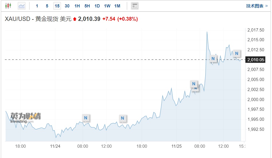 智通财经APP获悉,受美元走弱和押注美联储结束加息周期的支撑,同时市场焦点转向本周晚些时候公布的美国通胀数据,黄金价格周一一度攀升至6个月高点。数据显示,截至发稿,现货黄金上涨0.38%,至每盎司2010.39美元。美国黄金期货上涨0.38%,至每盎司2010.65美元。