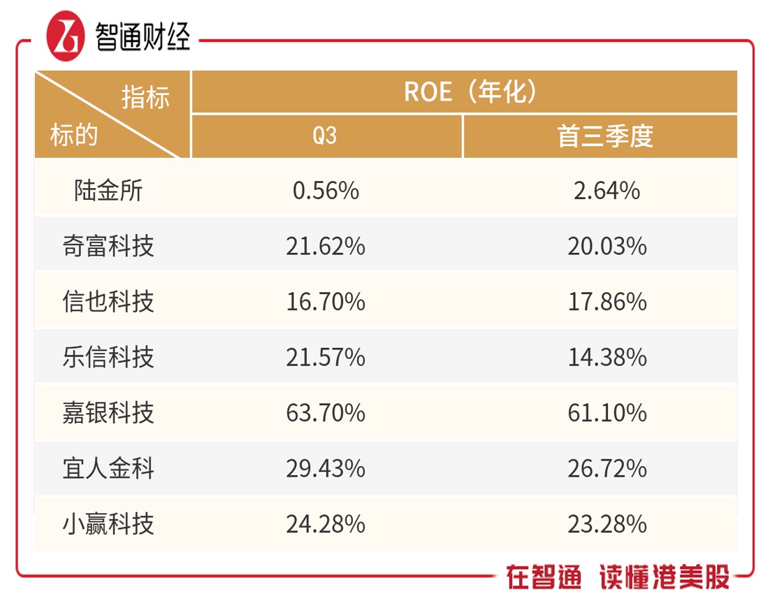 盈利表现最终落实到股东回报上,然而每家平台的权益杠杆不同,杠杆越高的标的,ROE(权益回报率)越高,首三季度,嘉银金科达61.1%,其次为宜人金科26.72%,前者的权益杠杆为后者的2倍。
