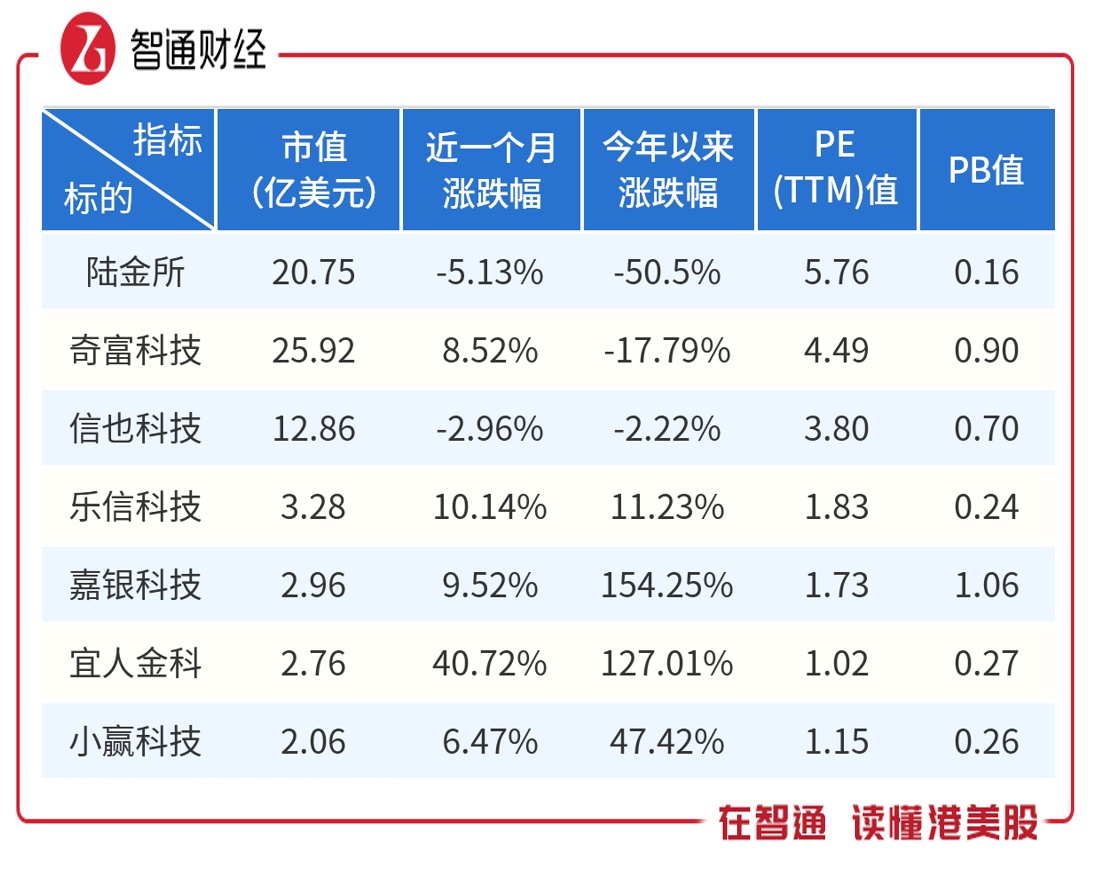 而从二级市场看,目前市值最大的为奇富科技,25.92亿美元,其次为陆金所20.75亿美元,今年业绩表现较好的个股则出现了大幅的市值增长,其中宜人金科及嘉银科技今年市值涨幅均翻倍。不过从整体估值上看,行业调整期已将个股打入估值低谷,PE值普遍在5倍以下,而PB值则在1倍以下。