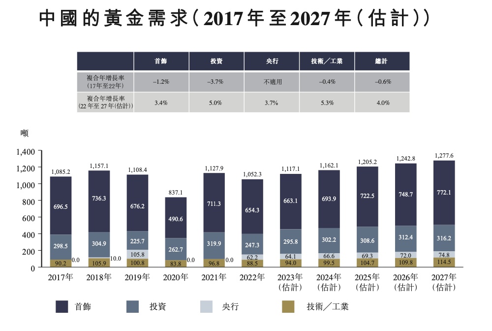 而在中国市场,据中国黄金协会公布的最新数据显示,2023年前三季度,我国黄金消费量达到835.07吨,同比增长7.32%。其中,黄金首饰消费达到552.04吨,同比增长5.72%;投资属性更强的金条及金币消费222.37吨,同比增长15.98%。弗若斯特沙利文预计,到2027年,中国黄金需求将达到1277.6吨,2022-2027年期间的年复合增长率为4.0%。