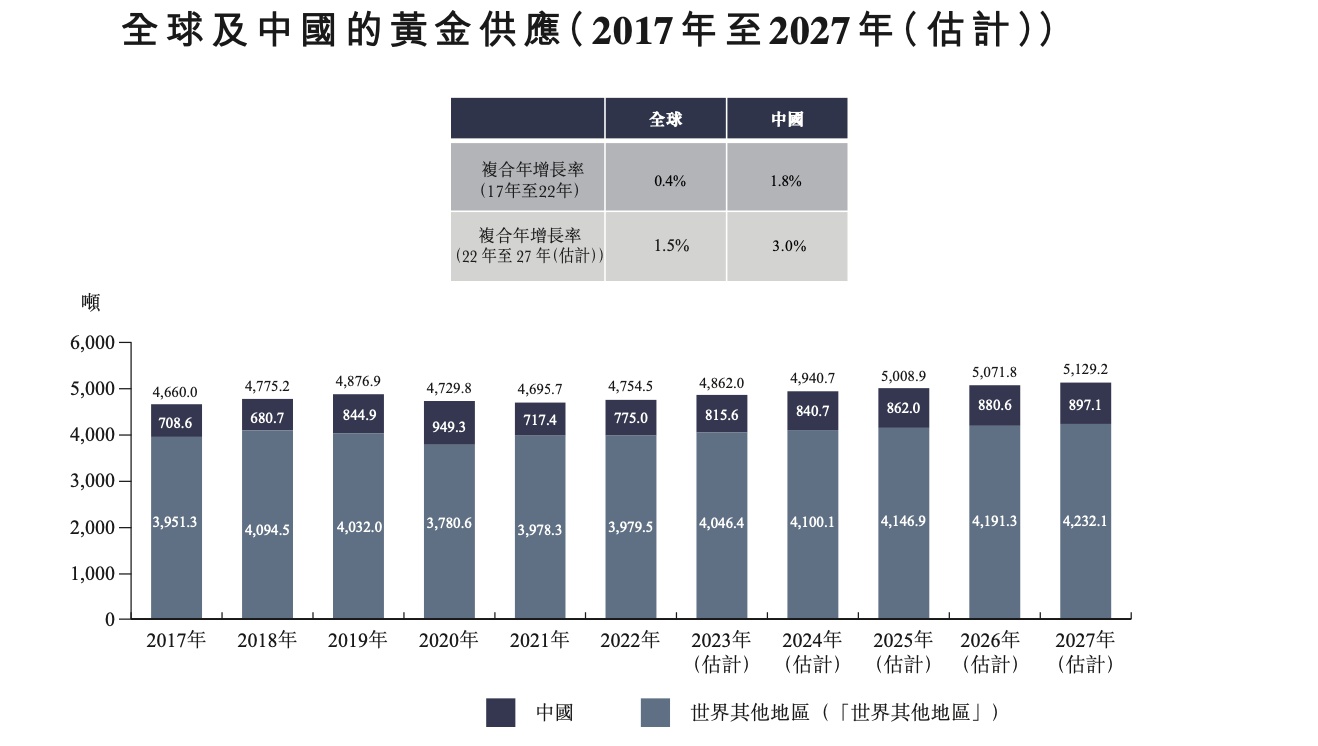 据弗若斯特沙利文报告显示,黄金的需求主要源于首饰制造、投资、技术╱工业及央行储备,其中首饰及投资是黄金需求的主动力。俄乌紧张局势、全球原油价格上升导致昂贵能源消耗,由于美联储持续加息,对2023年潜在全球经济衰退的担忧,以上多重因素导致央行增加黄金储量以对冲风险。其中,黄金投资预期于2022年至2027年期间将实现约5.3%的复合年增长率,而黃金首飾的全球需求预期在2022-2027年实现2.5%的年复合增长。