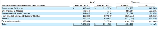 其中公司的大部分收入来自电动车和配件销售,2023上半年,该部门的收入从上年同期的499.17万美元增长近50%至749.68万美元。进一步细分来看,两轮电动车自行车的亮眼表现带动了萝贝智能的整体收入增长。