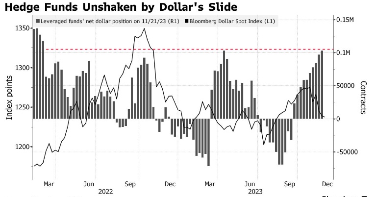 智通财经获悉,尽管美元本月因经济数据走软而下跌,且市场愈发预期美联储近30年来最激进的加息周期即将结束,但是对冲基金本月大举押注看涨美元。根据美国商品期货交易委员会(CFTC)的数据,截至11月21日,衡量杠杆基金对美元兑八种货币多头押注的美元净头寸指标升至2022年2月以来的最高水平。净多头仓位为103,042份,略高于4月创下的今年迄今高位。