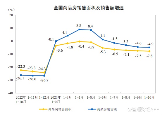 数据显示,2023年1-10月份,商品房销售面积92579万平方米,同比下降7.8%,其中住宅销售面积下降6.8%;商品房销售额97161亿元,下降4.9%,其中住宅销售额下降3.7%。