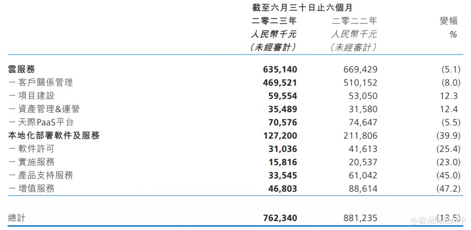 在收入结构方面,上半年明源云的云服务业务仍为营收主力,收入约6.35亿元,同比下降5.1%;本地化部署软件及服务占总体收入16.7%,上半年收入为1.27亿元,同比下降39.9%。