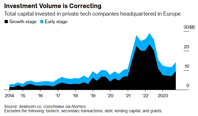 由于利率上升和公开市场低迷,各地的风险资本都已枯竭,无法再为更成熟的初创企业提供资金。该报告估计,2023年欧洲的科技投资为450亿美元,较2022年的820亿美元“大幅下降”。