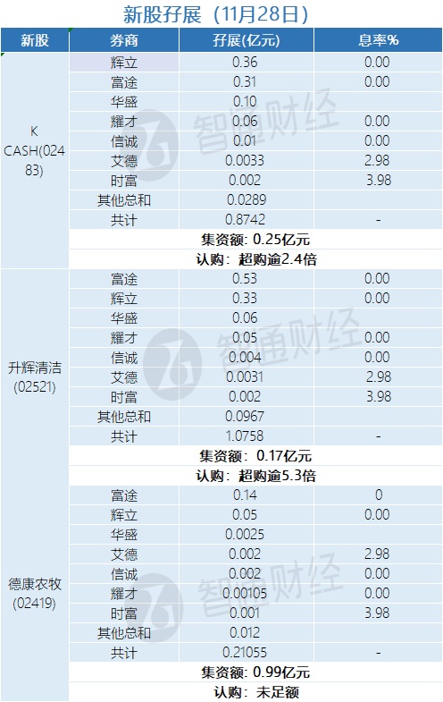 智通财经APP获悉,K Cash(02483)、升辉清洁(02521)、德康农牧(02419)正在招股中。截至11月28日,辉立、富途等券商合计为K