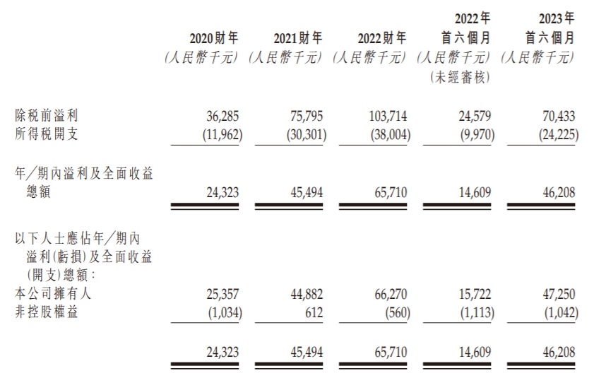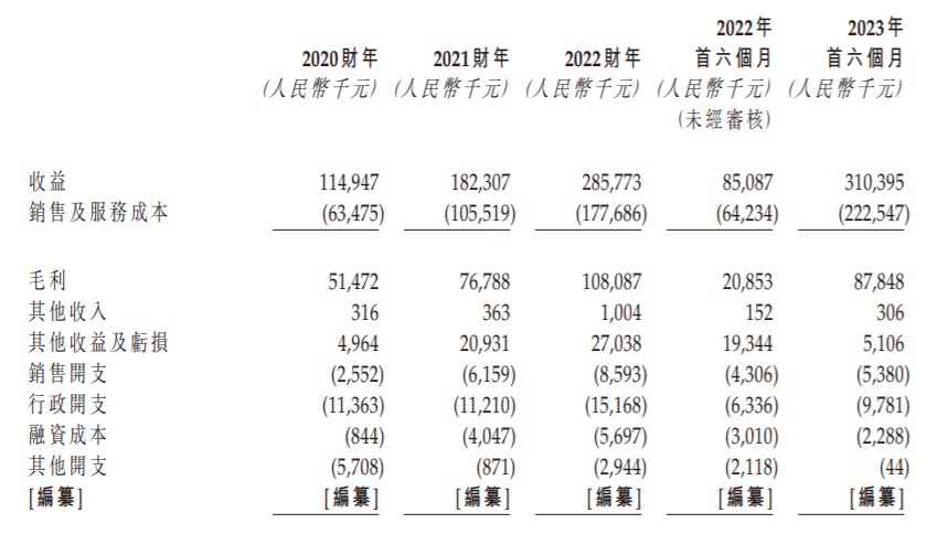 财务方面,于2020财年、2021财年、2022财年及2023年首六个月,灏辉国际的收益分别约为人民币1.15亿元、1.82亿元、2.86亿元及3.10亿元,同期,公司实现年内溢利分别为人民币2432.3万元、4549.4万元、6571.0万元以及4620.8万元。