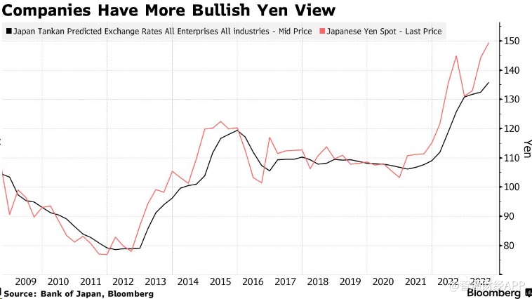 根据Bloomberg汇编的数据,东证500指数成份股公司发布了截至2024年3月的财年指引,它们的预测基于日元兑美元在此期间的平均汇率为140.22日元兑1美元。这比目前的汇率高出5%,高于该财年开始以来的平均水平,也高于外汇策略师的预测中值。