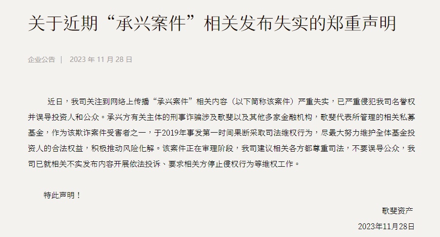 智通财经APP获悉,11月28日,歌斐资产发布声明称:近日,我司关注到网络上传播“承兴案件”相关内容(以下简称该案件)严重失实,已严重侵犯我司名誉权并误导投资人和公众。承兴方有关主体的刑事诈骗涉及歌斐以及其他多家金融机构,歌斐代表所管理的相关私募基金,作为该欺诈案件受害者之一,于2019年事发第一时间果断采取司法维权行为,尽最大努力维护全体基金投资人的合法权益,积极推动风险化解。该案件正在审理阶段,我司建议相关各方都尊重司法,不要误导公众,我司已就相关不实发布内容开展依法投诉、要求相关方停止侵权行为等维权工作。