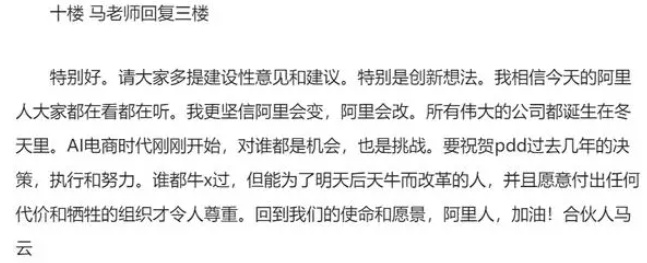 对此,马云以“合伙人马云”的身份回帖表示:“特别好。请大家多提建设性意见和建议。特别是创新想法。我相信今天的阿里人大家都在看都在听。我更坚信阿里会变,阿里会改。所有伟大的公司都诞生在冬天里。AI电商时代刚刚开始,对谁都是机会,也是挑战。要祝贺pdd过去几年的决策,执行和努力。谁都牛x过,但能为了明天后天牛而改革的人,并且愿意付出任何代价和牺牲的组织才令人尊重。回到我们的使命和愿景,阿里人,加油!”