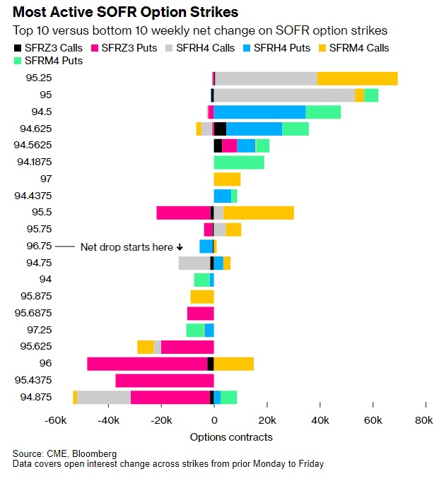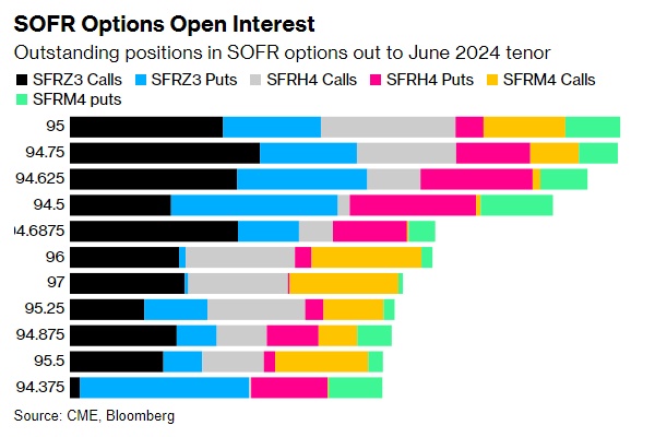 CME的未平仓合约数据显示,上周,在2024年3月到期的SOFR期权中,95.25和95.00的看涨合约有所增加,该期间的交易还包括买入94.75/95.00/95.25的蝶式看涨组合和Mar24 94.75-94.875/95.00/95.125鹰式看涨组合,明显的清仓包括94.875的看涨期权,作为94.75/94.875看涨期权价差组合的一部分出售。