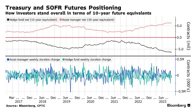 截至11月21日当周的CFTC数据显示,对冲基金继续做多SOFR期货,净多头头寸创下新纪录,相当于每波动1基点约影响3000万美元。在美国国债期货方面,资产管理公司平仓了约7.6万份10年期国债合约,而对冲基金则增加了约3.3万份10年期国债合约的净空头。