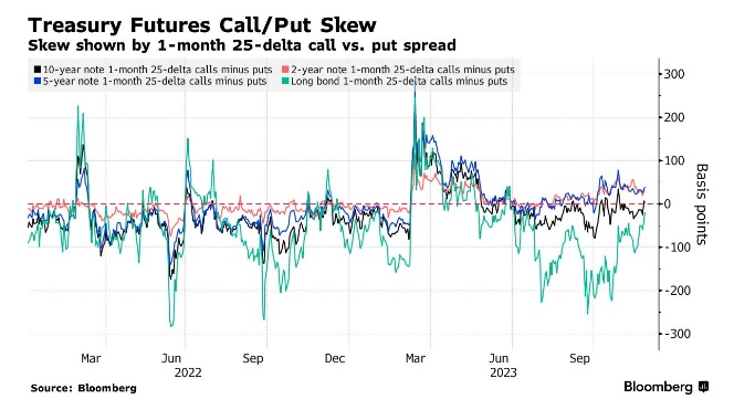 过去一周,随着长期债券期货的偏斜从负值逐渐接近中性,在收益率曲线的长端从当前水平对冲抛售的成本有所下降。与此同时,投资者正在支付溢价,以对冲两年期和五年期国债期货的进一步上涨,从而延长了收益率曲线前端和后端之间的偏斜差距。