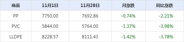据生意社价格监测,2023年11月塑料期货价格整体全线走跌,具体为:PP(拉丝)(-0.74%)、PVC(-1.37%)、LLDPE(-1.42%)。