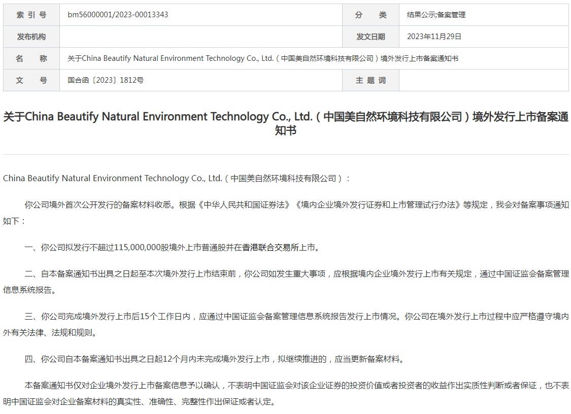 智通财经APP获悉,11月29日,中国证监会发布关于中国美自然环境科技有限公司 (美自然)境外发行上市备案通知书。该公司拟发行不超过1.15亿股境外上市普通股并在香港联合交易所上市。据港交所6月30披露,美自然向港交所主板提交上市申请,华泰国际为独家保荐人。