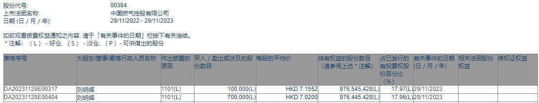 智通财经APP获悉,香港联交所最新资料显示,11月28日、11月29日,主席刘明辉分别增持中国燃气(00384)70万股、10万股,合计80万股,每股作价分别为7.02港元、7.1552港元,总金额约为562.95万港元。增持后最新持股数目约为9.77亿股,最新持股比例为17.97%。