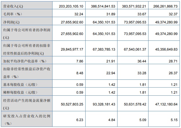 报告期末,公司研发人员占比超过15%,报告期内,公司研发投入一直维持在较高水平,分别为1370.06万元、1954.14万元、1869.06万元和1265.32万元,公司核心技术产品收入占主营业务收入的比例分别为99.41%、98.98%、97.75%和99.44%,产生了良好的经济效益。