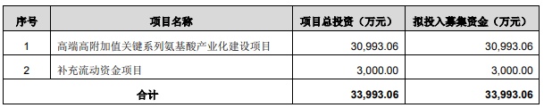 公司本次发行募集资金拟用于高端高附加值关键系列氨基酸产业化建设项目及补充流动资金项目。