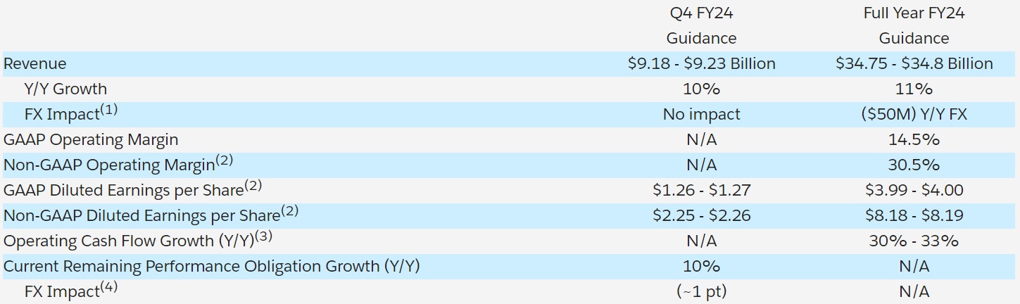 其次,赛富时还将全年营收指引收窄至347.5亿至348亿美元(此前指引为347亿至348亿美元),同比增长11%;还将全年GAAP营业利润率指引上调至14.5%,非GAAP营业利润率指引上调至30.5%(此前指引为30.5%);将24财年全年营业现金流增长预期上调至30%至33%。该公司还预计23财年Non-GAAP每股收益为8.18-8.19美元。