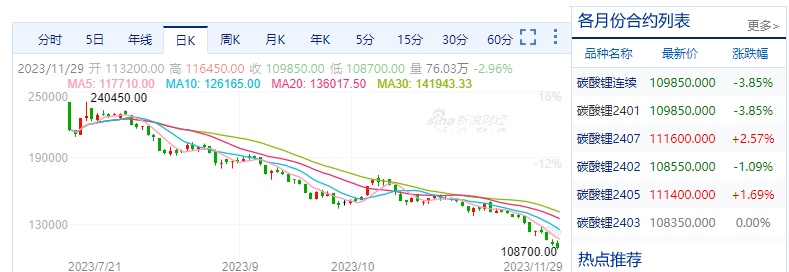 智通财经APP获悉,11月29日,上海钢联发布的数据显示,电池级碳酸锂下跌2000元/吨,均价报13.4万元/吨,创今年新低。期货方面,碳酸锂主力合约跌破11万关口,报109850元/吨,日内跌近4%,续创上市以来新低。
