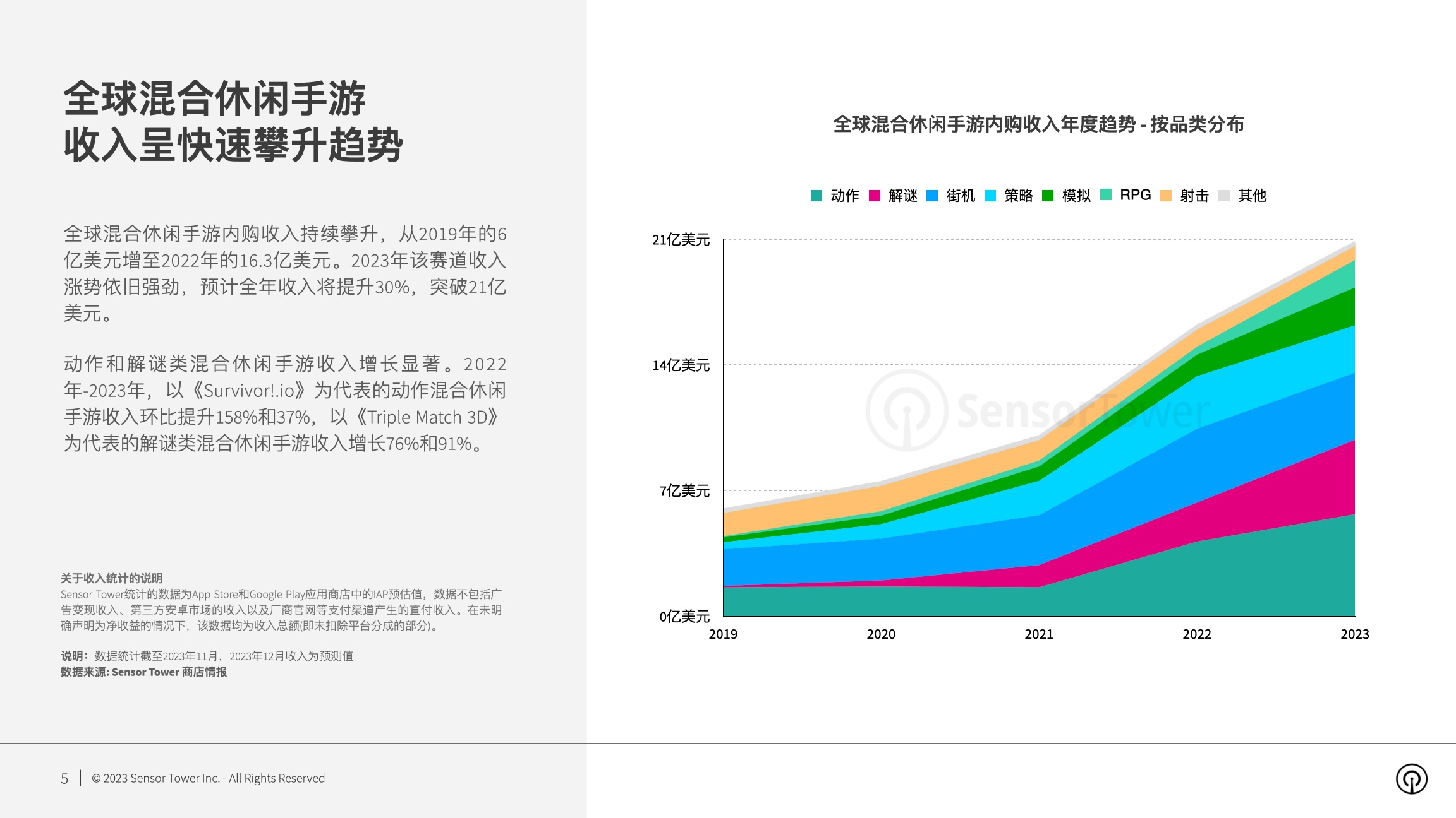 Tower发文称,混合休闲手游内购收入持续攀升,从2019年的6亿美元增至2022年的16.3亿美元。2023年赛道涨势依旧强劲,全年收入有望提升30%超过21亿美元,动作和解谜类混合休闲手游收入增长最显著。