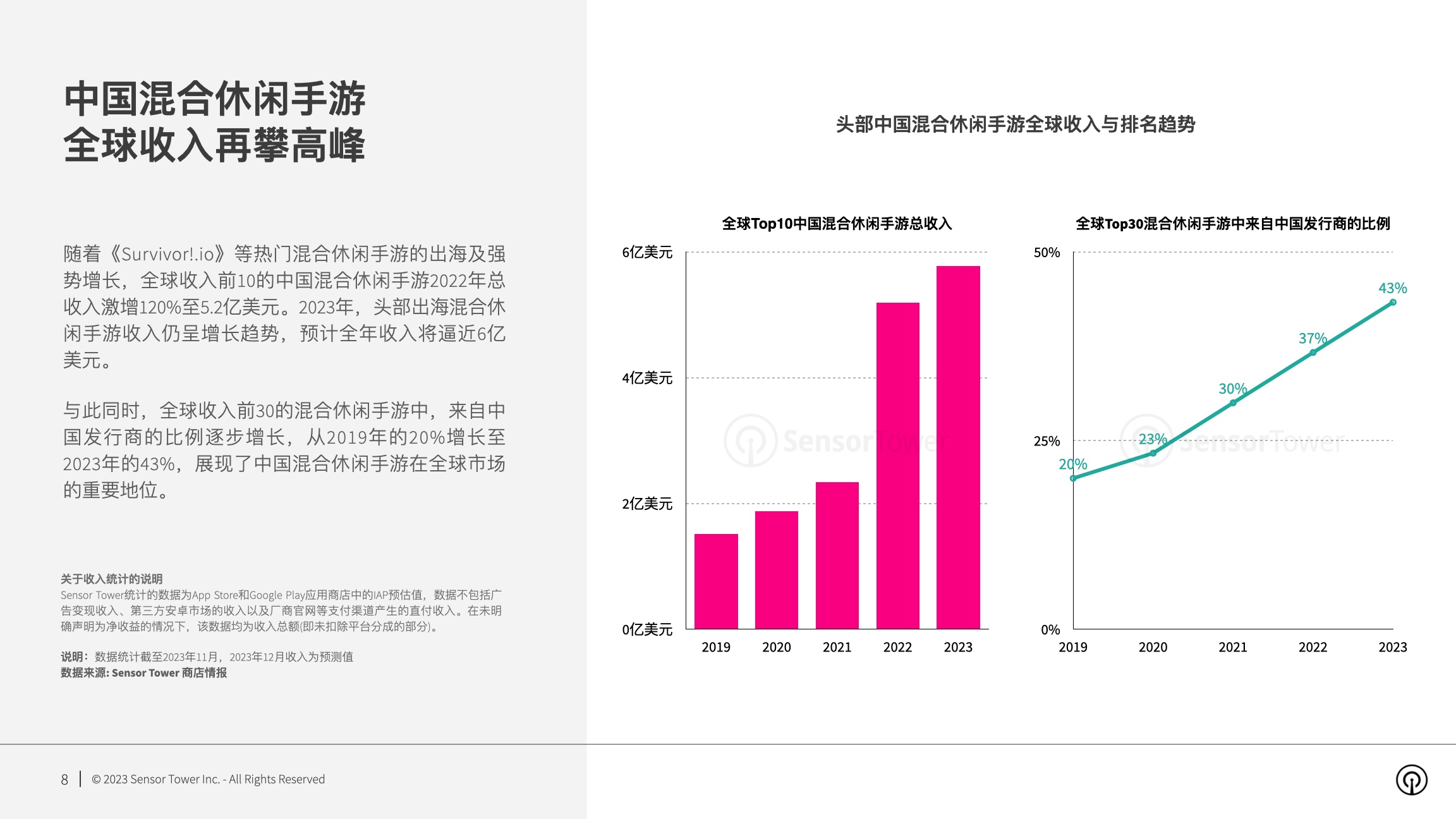 与此同时,中国混合休闲手游在全球市场的排名不断提升,跻身全球收入榜Top30的中国混合休闲手游比例,从2019年的20%增长至2023年的43%。