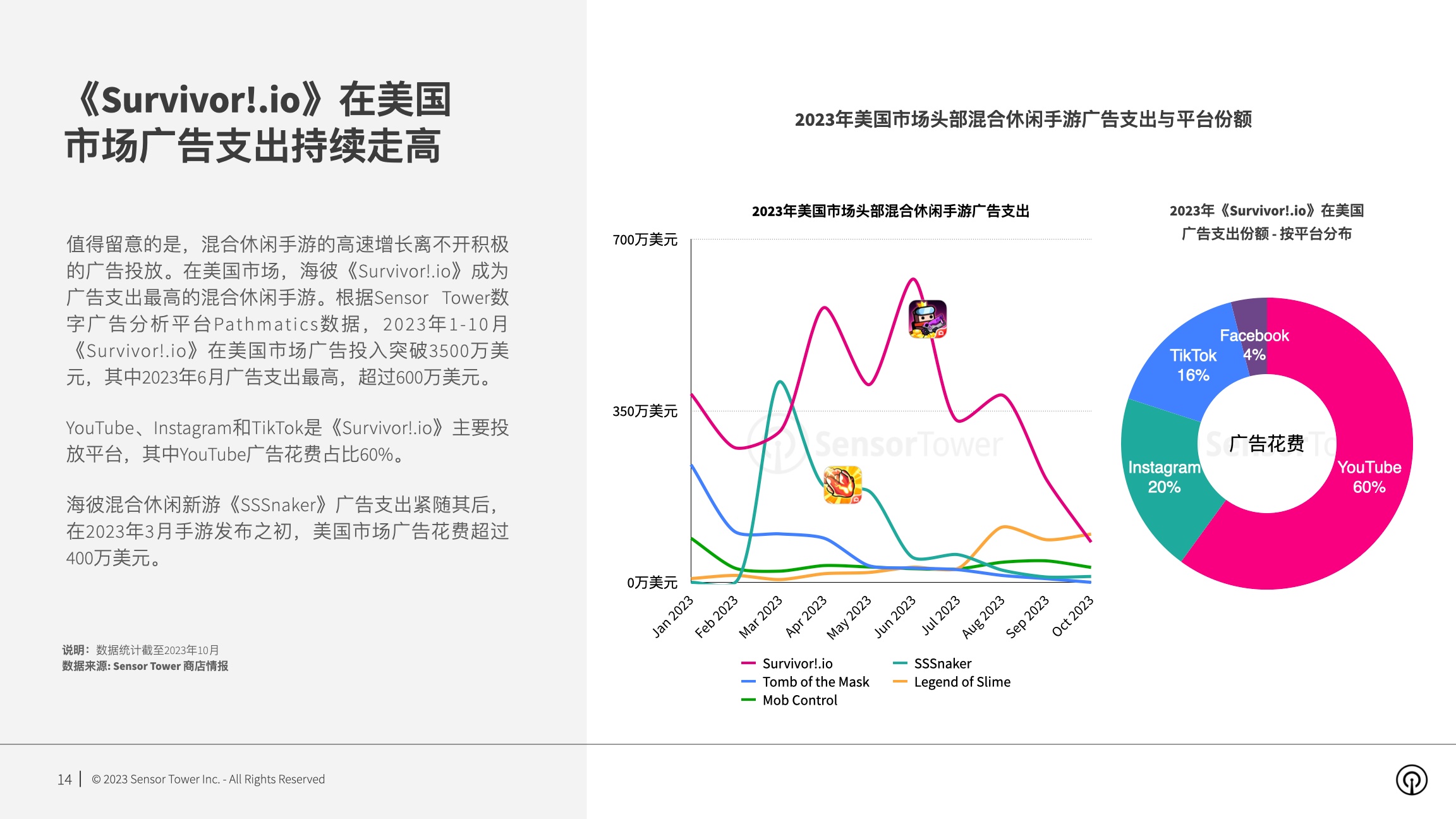混合休闲手游的高速增长离不开积极的广告投放。根据Sensor Tower数字广告分析平台Pathmatics数据,2023年1-10月《Survivor!.io》在美国市场广告投入突破3500万美元,成为花费最高的混合休闲手游,其中YouTube广告花费占比60%。