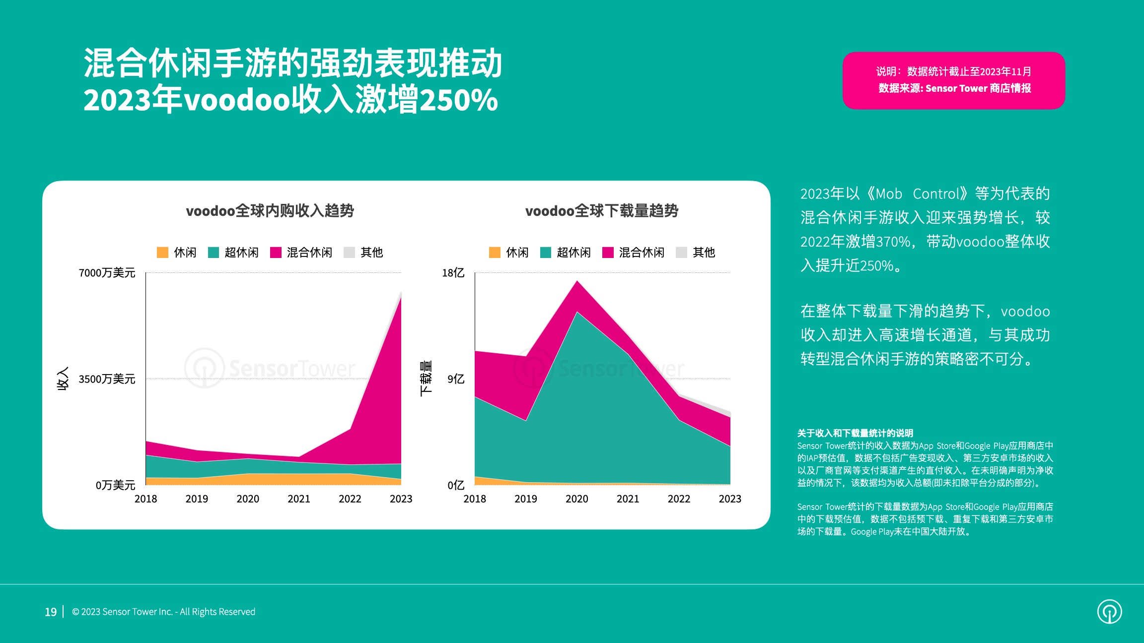 超休闲手游发行商voodoo从2021年开始向混合休闲市场转型,2023年以《Mob Control》等为代表的混合休闲手游收入迎来强势增长,成功推动发行商全球收入提升近250%。