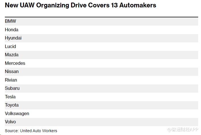 UAW的目标是组织13家公司的近15万名员工,这将使工会的汽车工人人数增加一倍。目标汽车制造商包括宝马和日产汽车(NSANY.US)等外国公司,以及Rivian Automotive(RIVN.US)和Lucid Group(LCID.US)等电动汽车制造商。