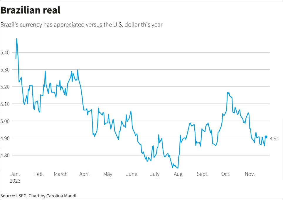 今年以来,巴西雷亚尔兑美元汇率已上涨约8%。